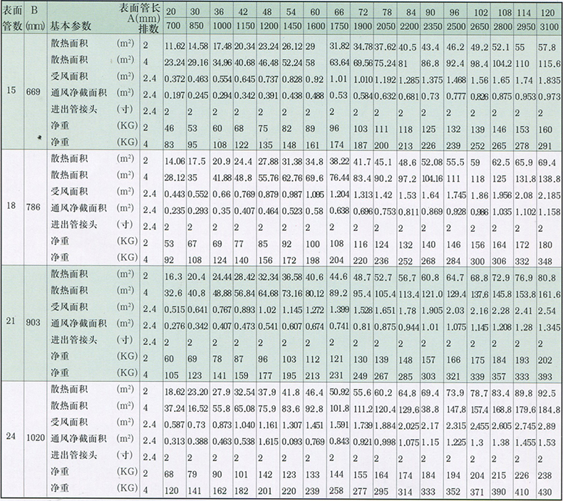 如采用四排,表面管數(shù)為10,管長(zhǎng)為42英寸時(shí),則為GLⅡ-4-10-42。